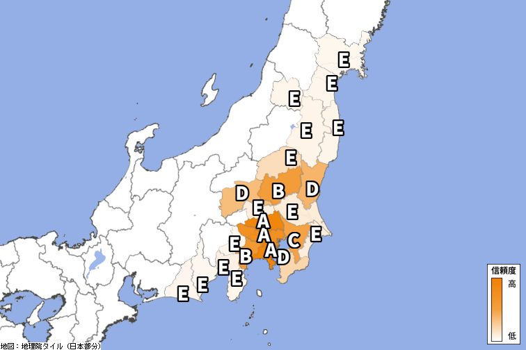 宮城北部 、宮城南部 、山形置賜 、福島中通り 、福島浜通り 、茨城南部 、栃木北部 、埼玉北部 、千葉北東部 、山梨東部 、静岡伊豆 、静岡東部 、静岡中部 、静岡西部