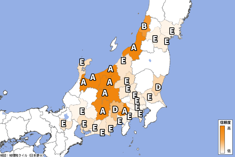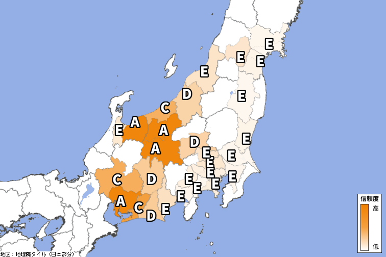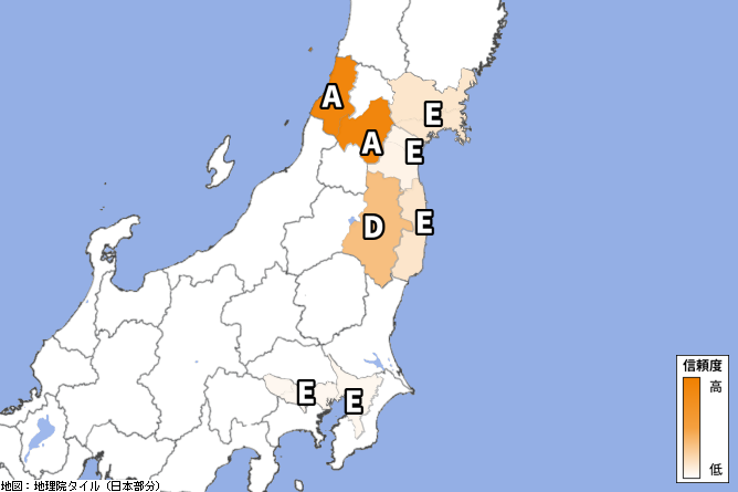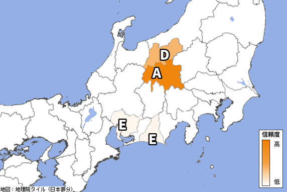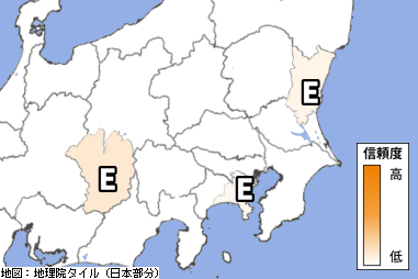 北海道 石狩 、北海道 渡島 、福島浜通り 、茨城北部 、栃木南部 、埼玉南部 、千葉北西部 、千葉南部 、東京 、神奈川東部 、静岡東部 、静岡中部 、北海道 胆振